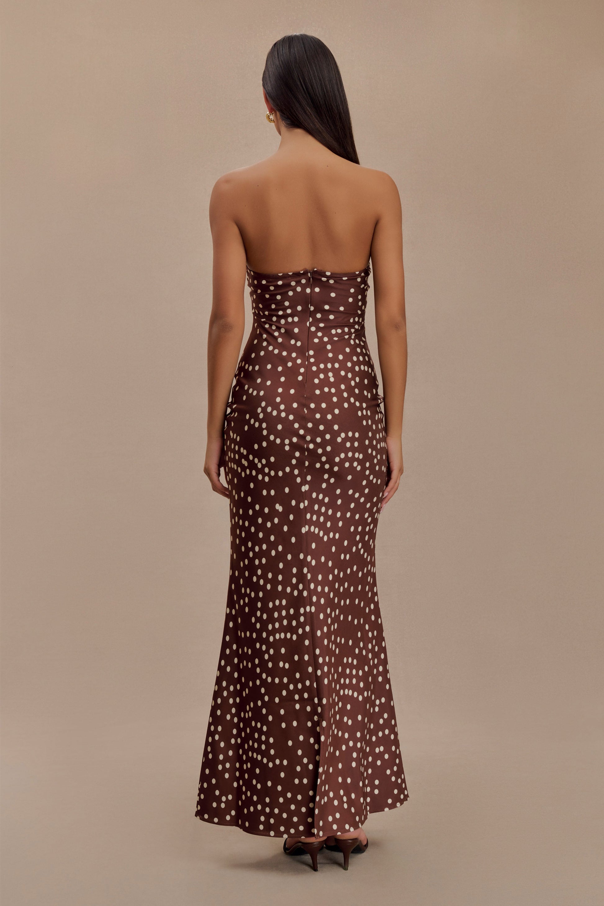 Claudette Strapless Satin Maxi Dress - Brown Polka Dot Print