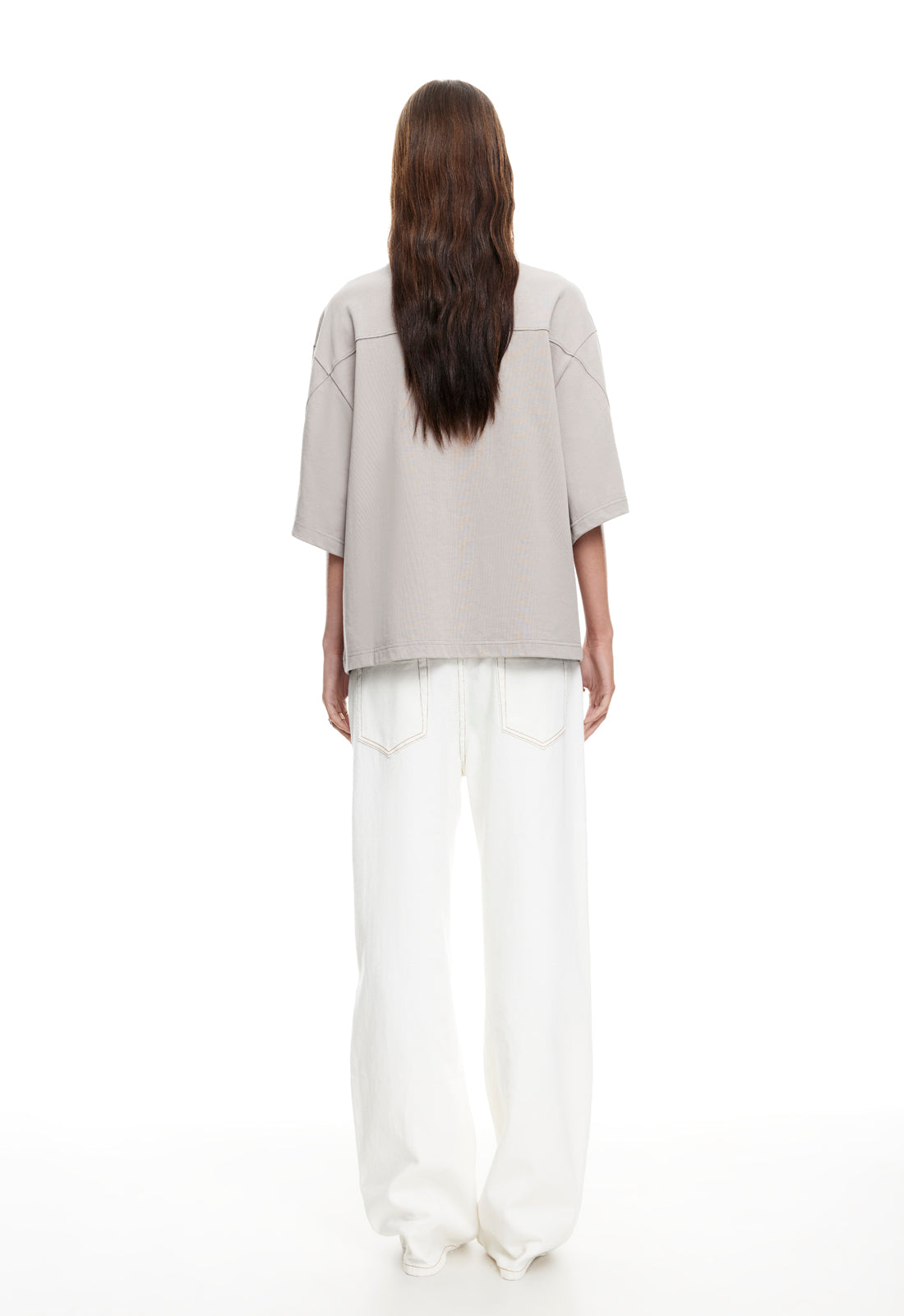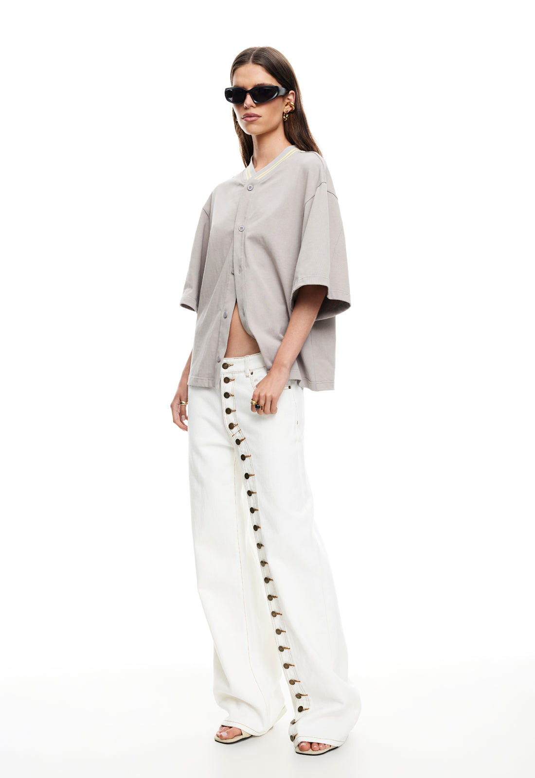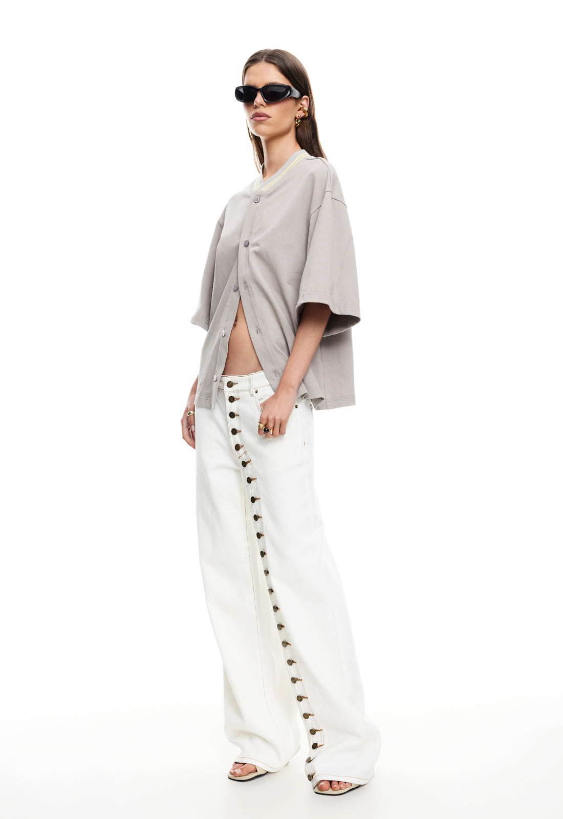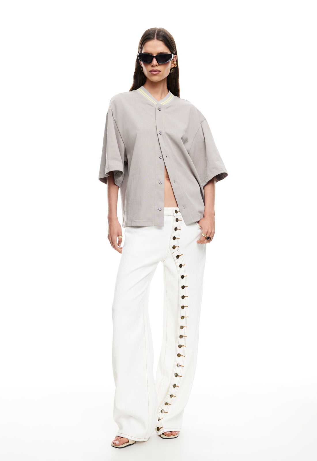 Crop top, silicon strip, folded-over pants, elasticated waistband, straight leg, mid-rise fit