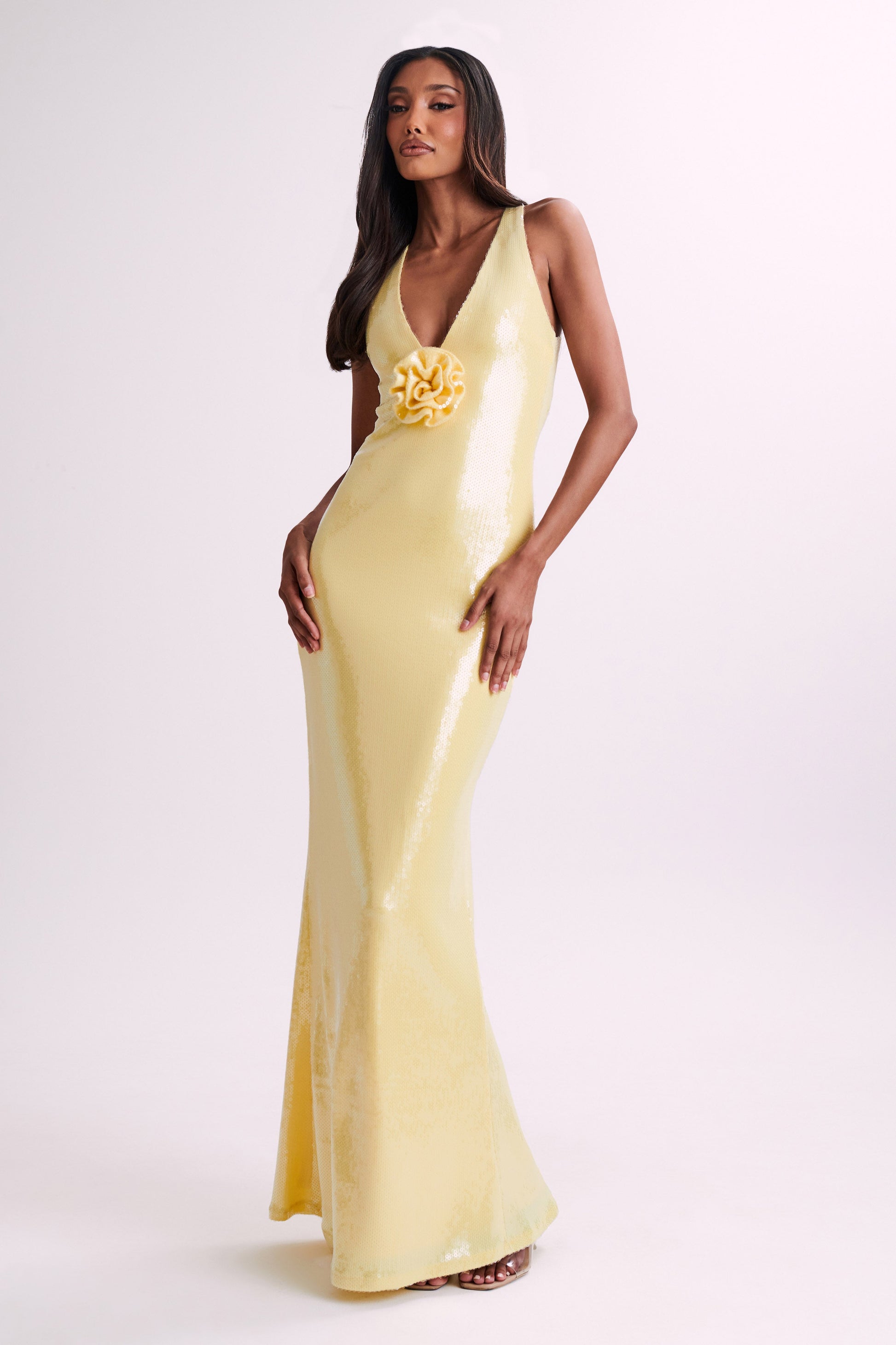 The ELIZA is a sleeveless maxi dress with a deep V-neckline and shimmery diamante-studded fabrication. The shoulder straps are wide and supportive, crossing elegantly at the upper back. Its neckline tapers into a cinched waistline and is accentuated with a delicate rose decor in the centre of the dip. The pure polyester fabric offers a bodycon yet comfortable fit, creating a form-flattering silhouette. Complete the look with the Dasha Sling Back Heels.
