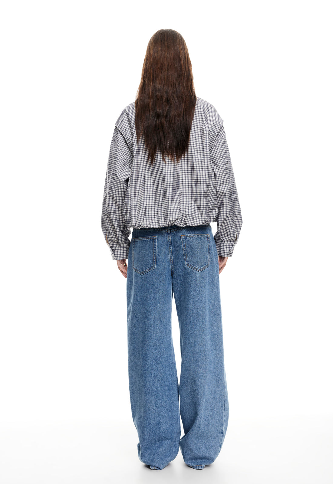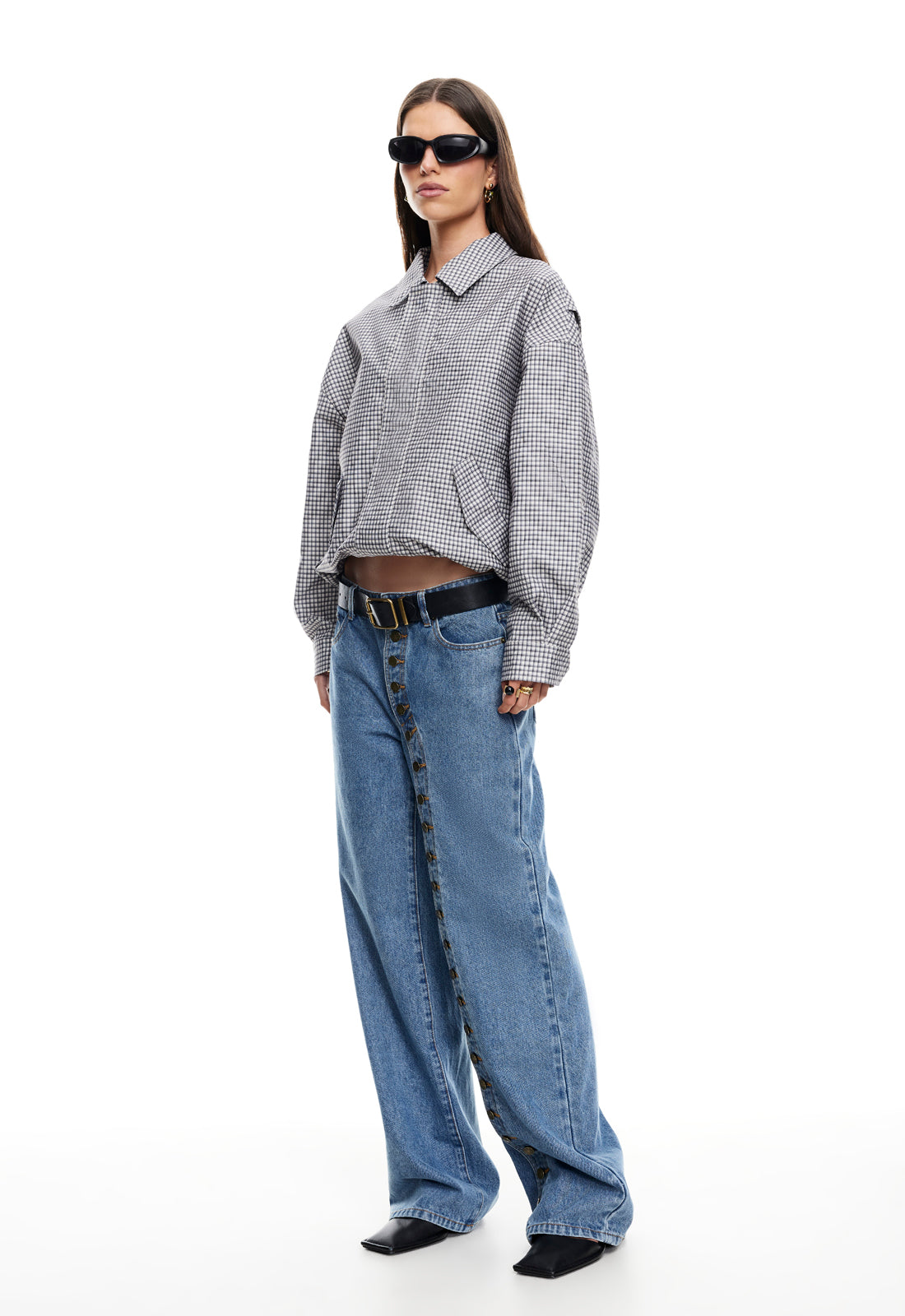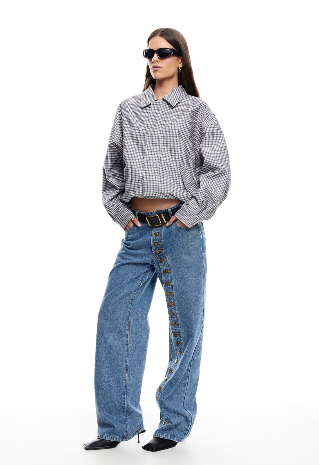Check print, collared, button-up closure, ruched