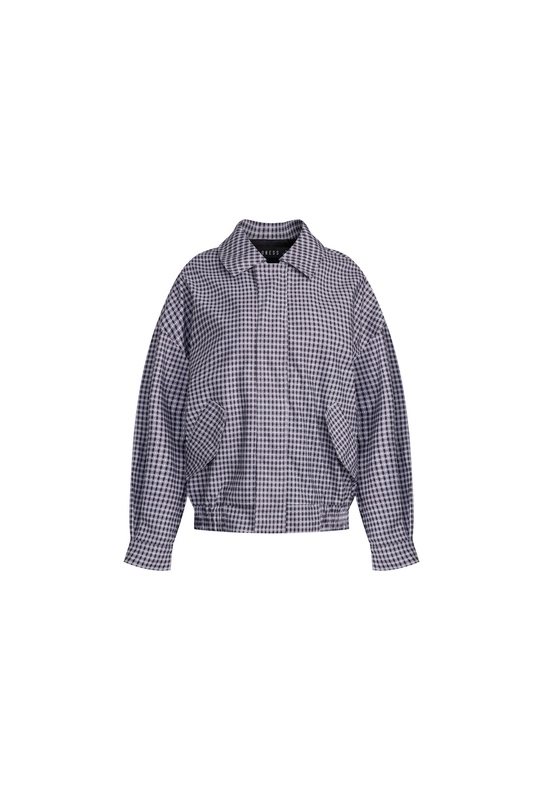 Check print, collared, button-up closure, ruched