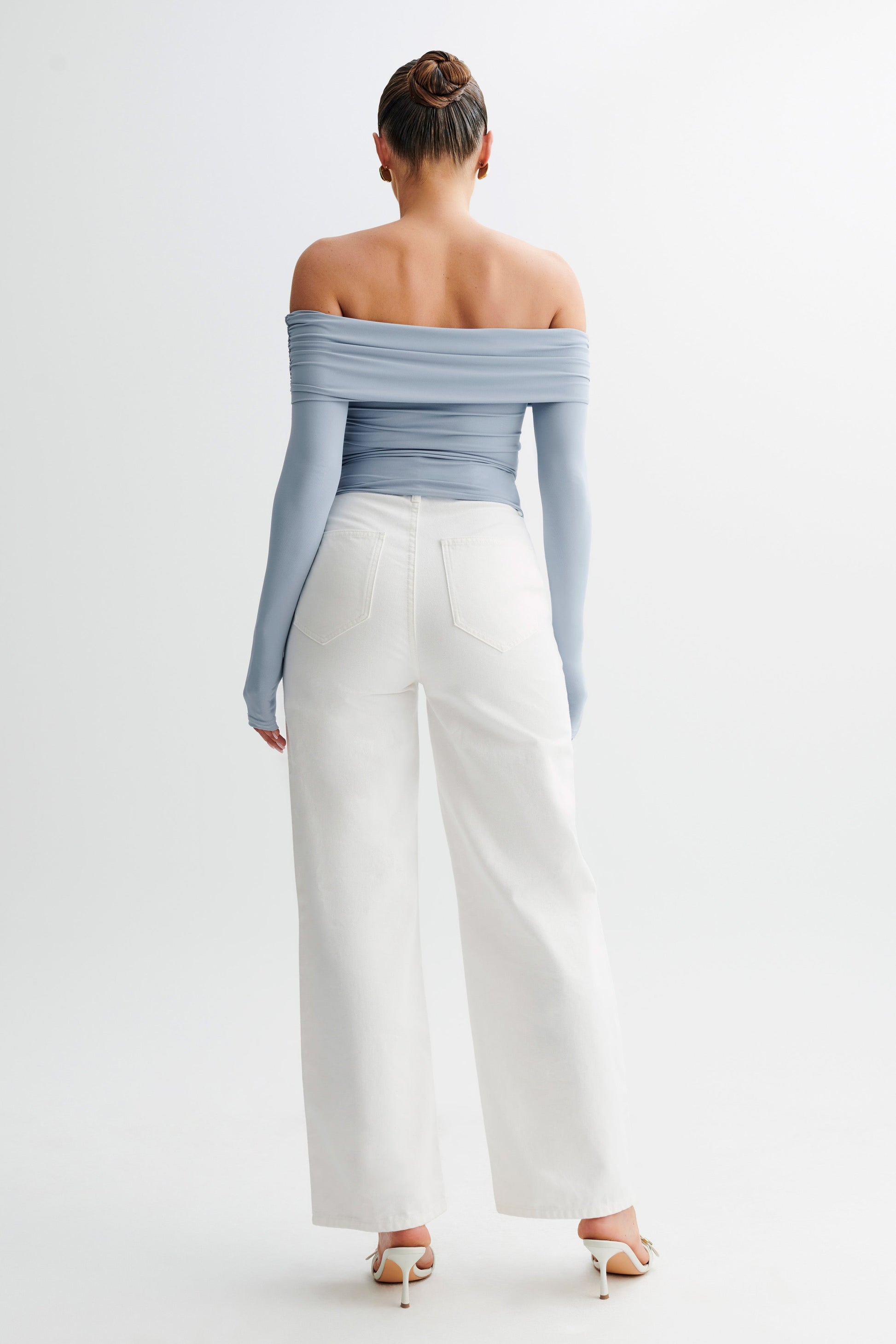 LUCINDA is a long-sleeved off-shoulder top with a ruched neckline and a slightly cropped torso. Cut from comfortable, preferred fibres, it has a semi-bodycon fit that hugs and flatters your curves. A modest piece with a modern design, this top is fresh and versatile.