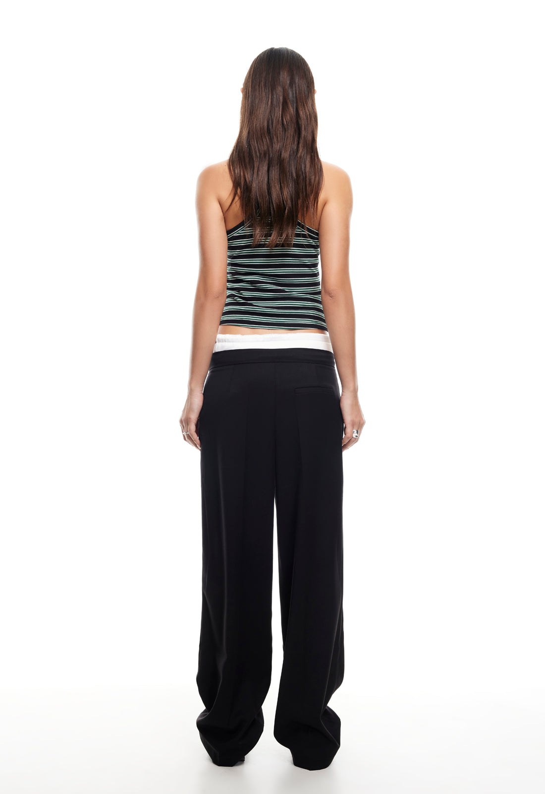 Crop top, silicon strip, folded-over pants, elasticated waistband, straight leg, mid-rise fit