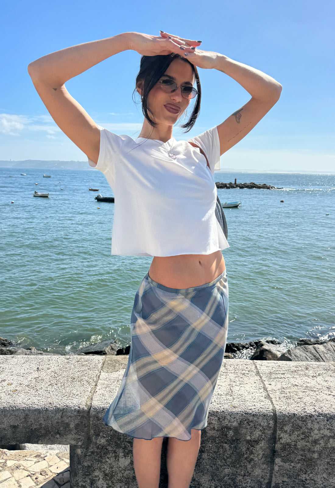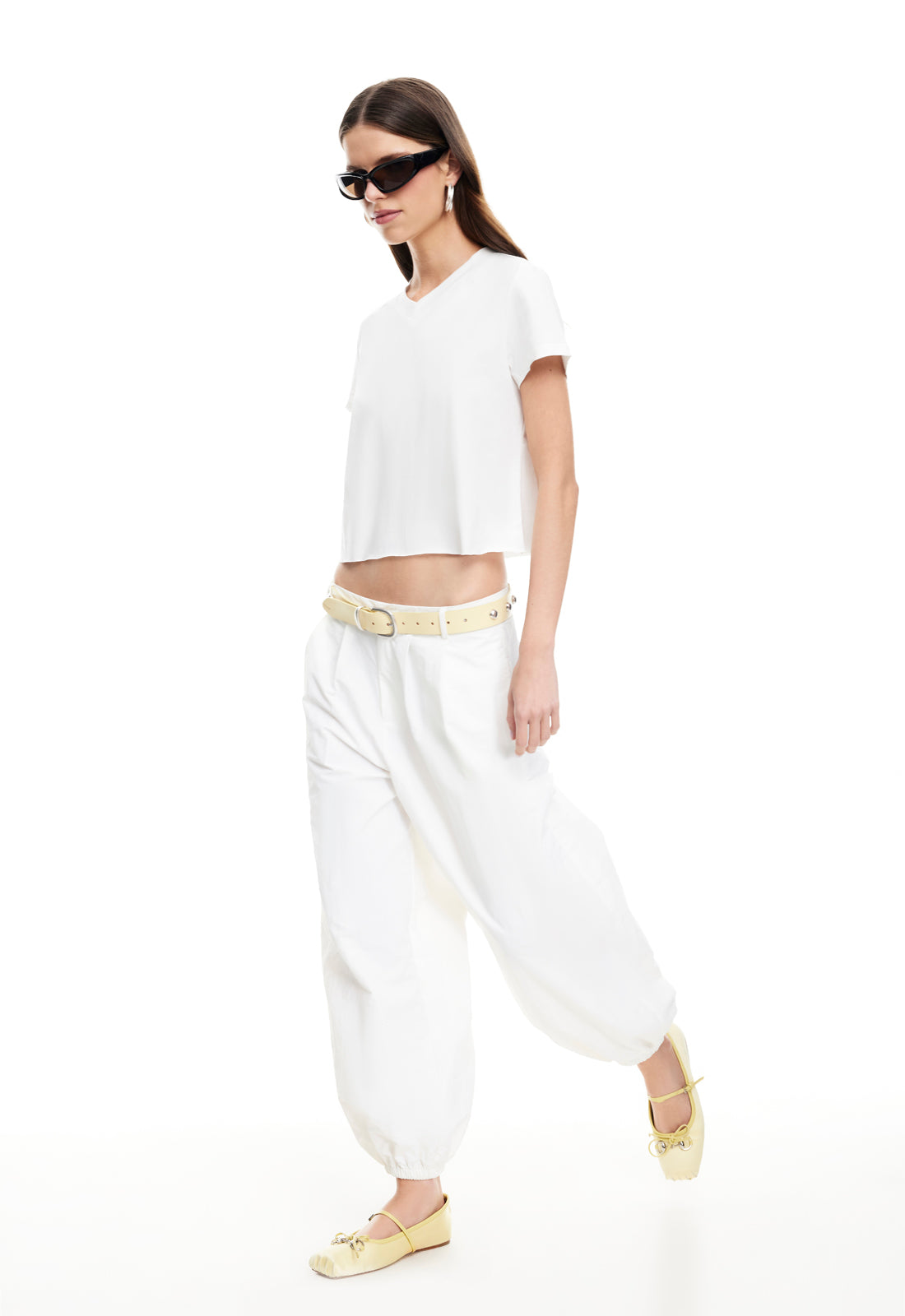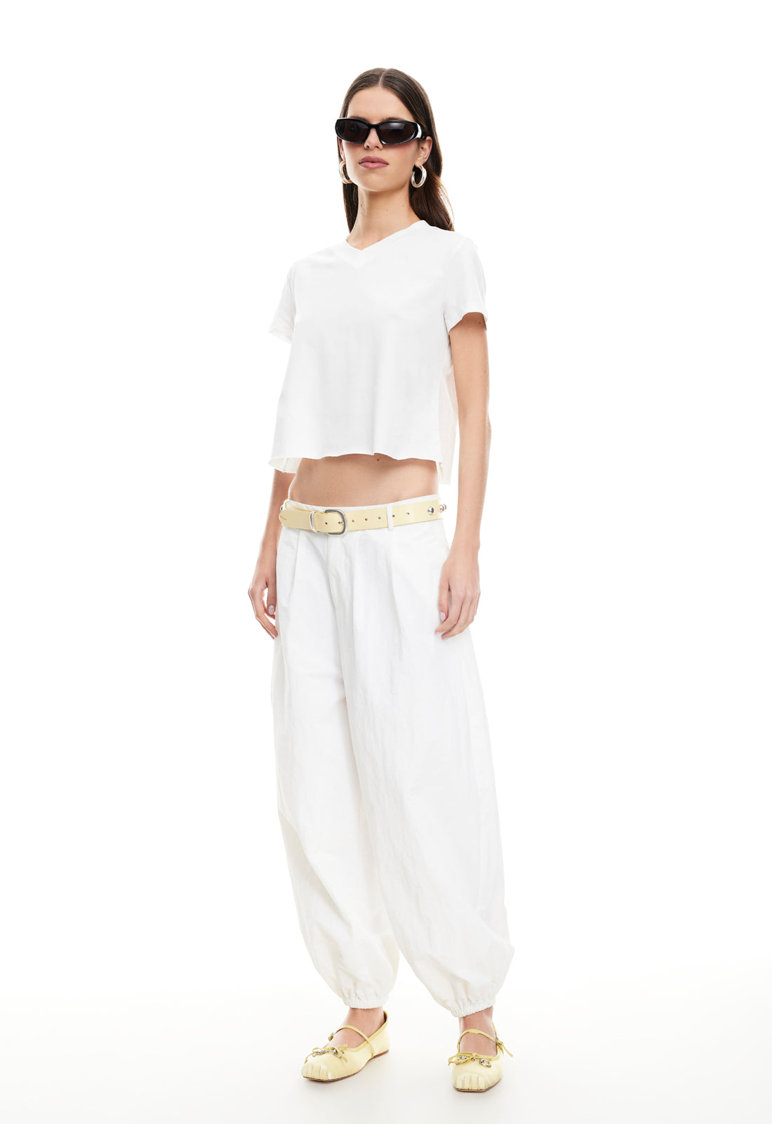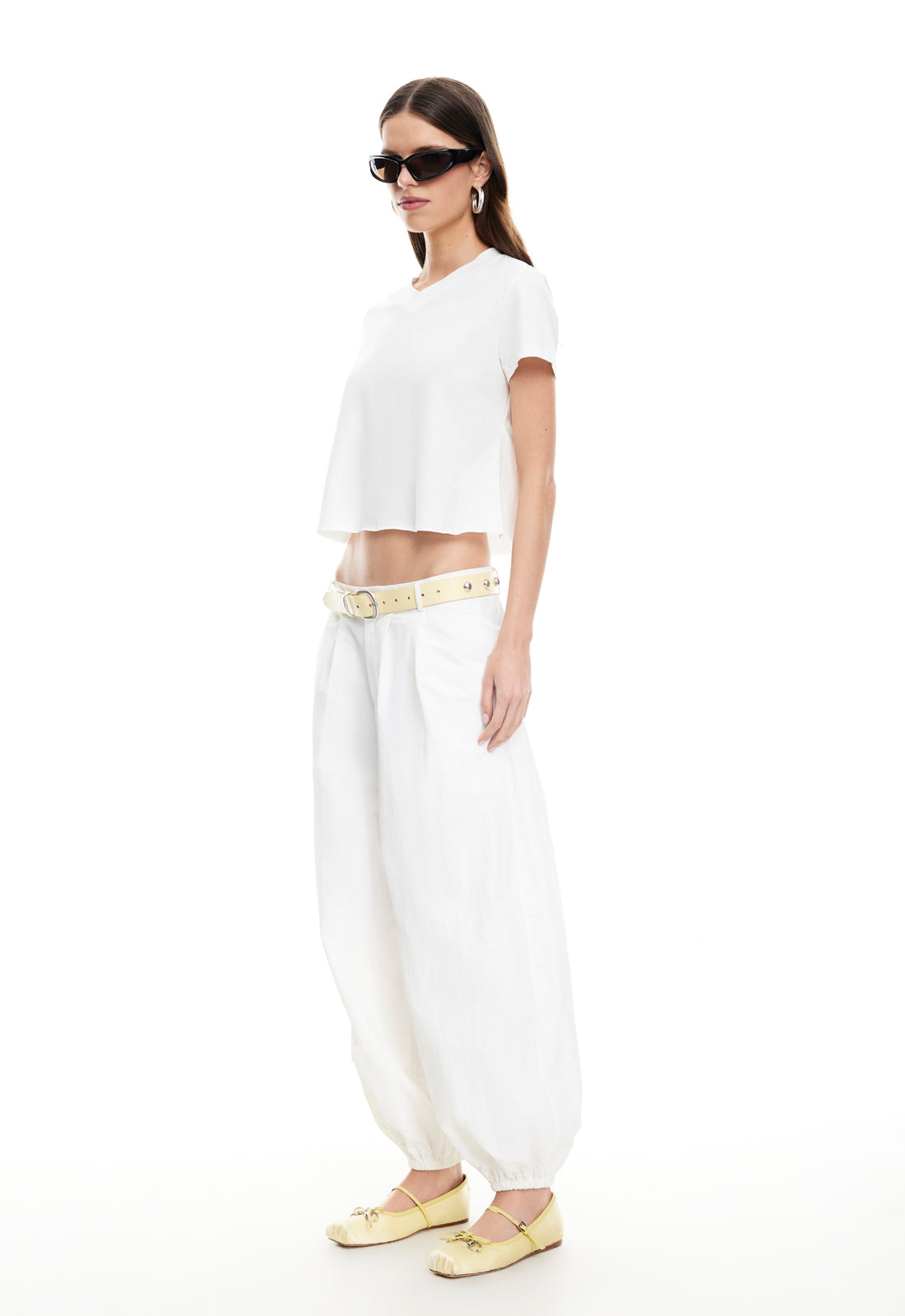 Crop top, silicon strip, folded-over pants, elasticated waistband, straight leg, mid-rise fit
