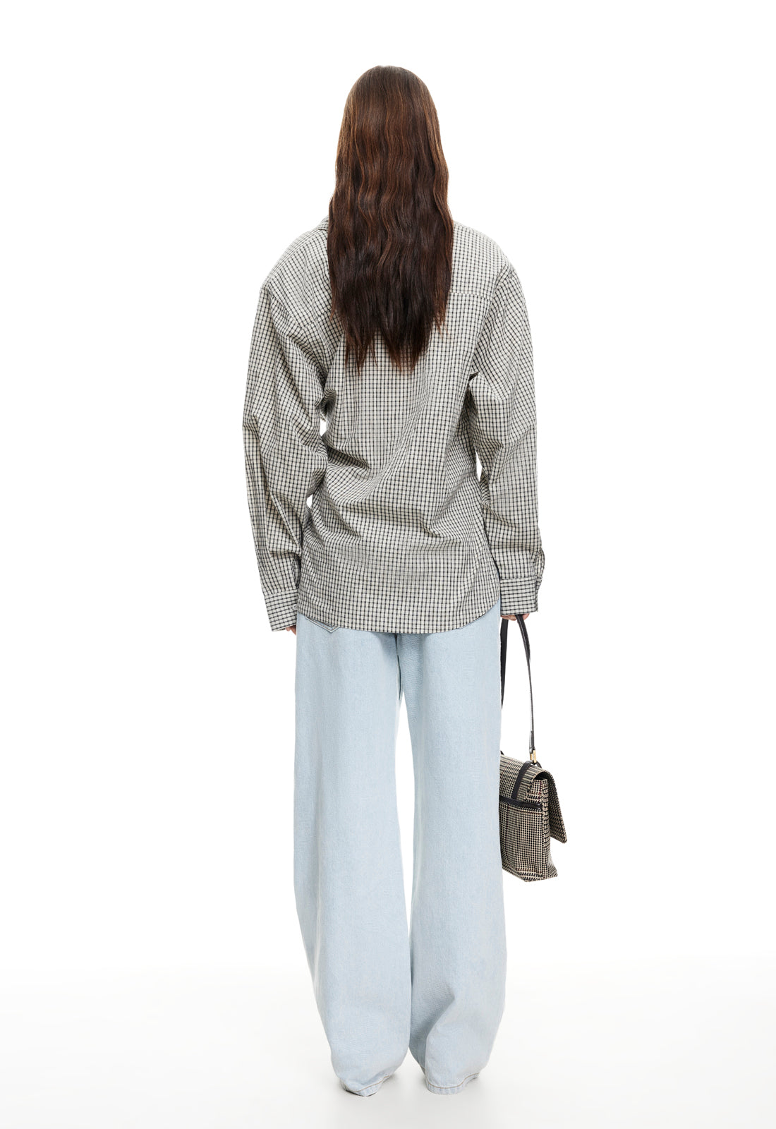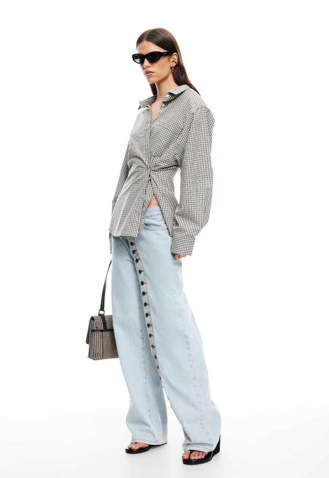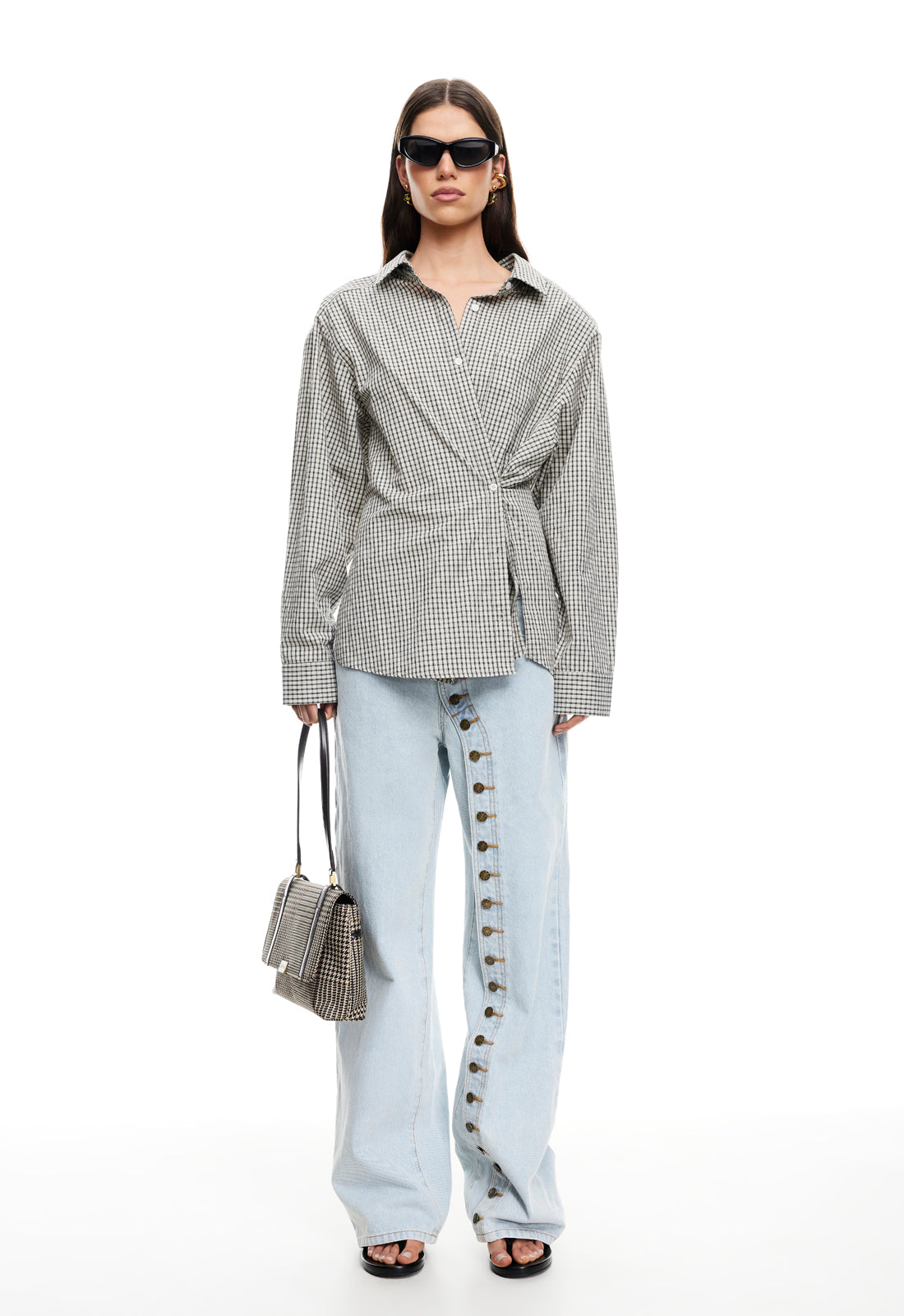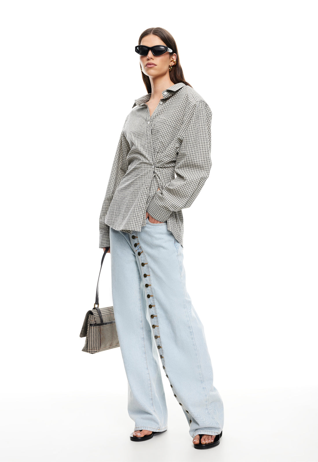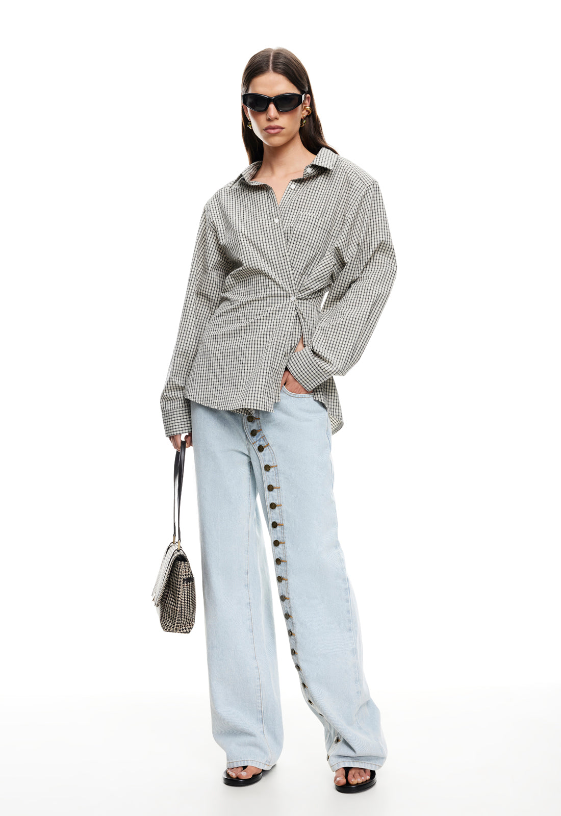 Check print, collared, button-up closure, ruched