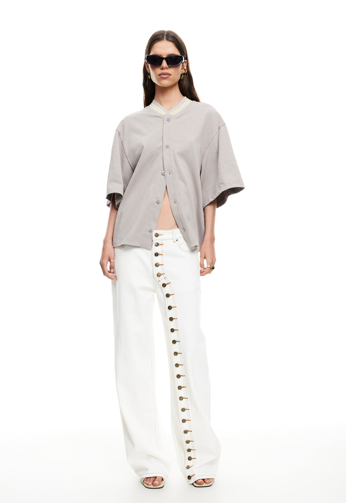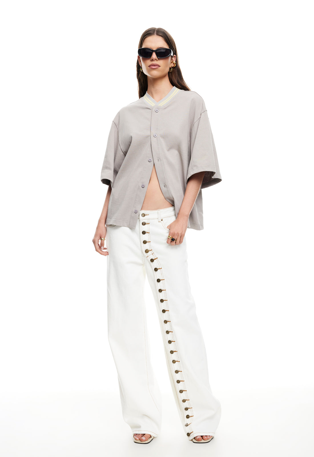 Crop top, silicon strip, folded-over pants, elasticated waistband, straight leg, mid-rise fit
