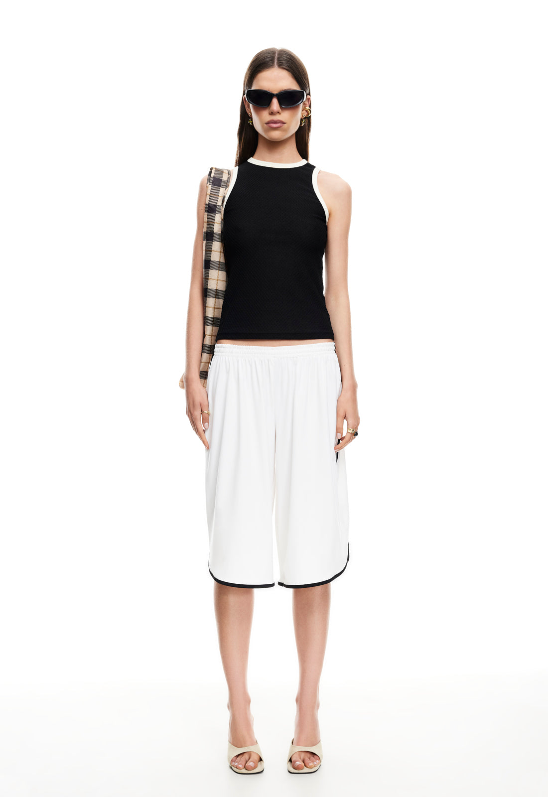 Crop top, silicon strip, folded-over pants, elasticated waistband, straight leg, mid-rise fit