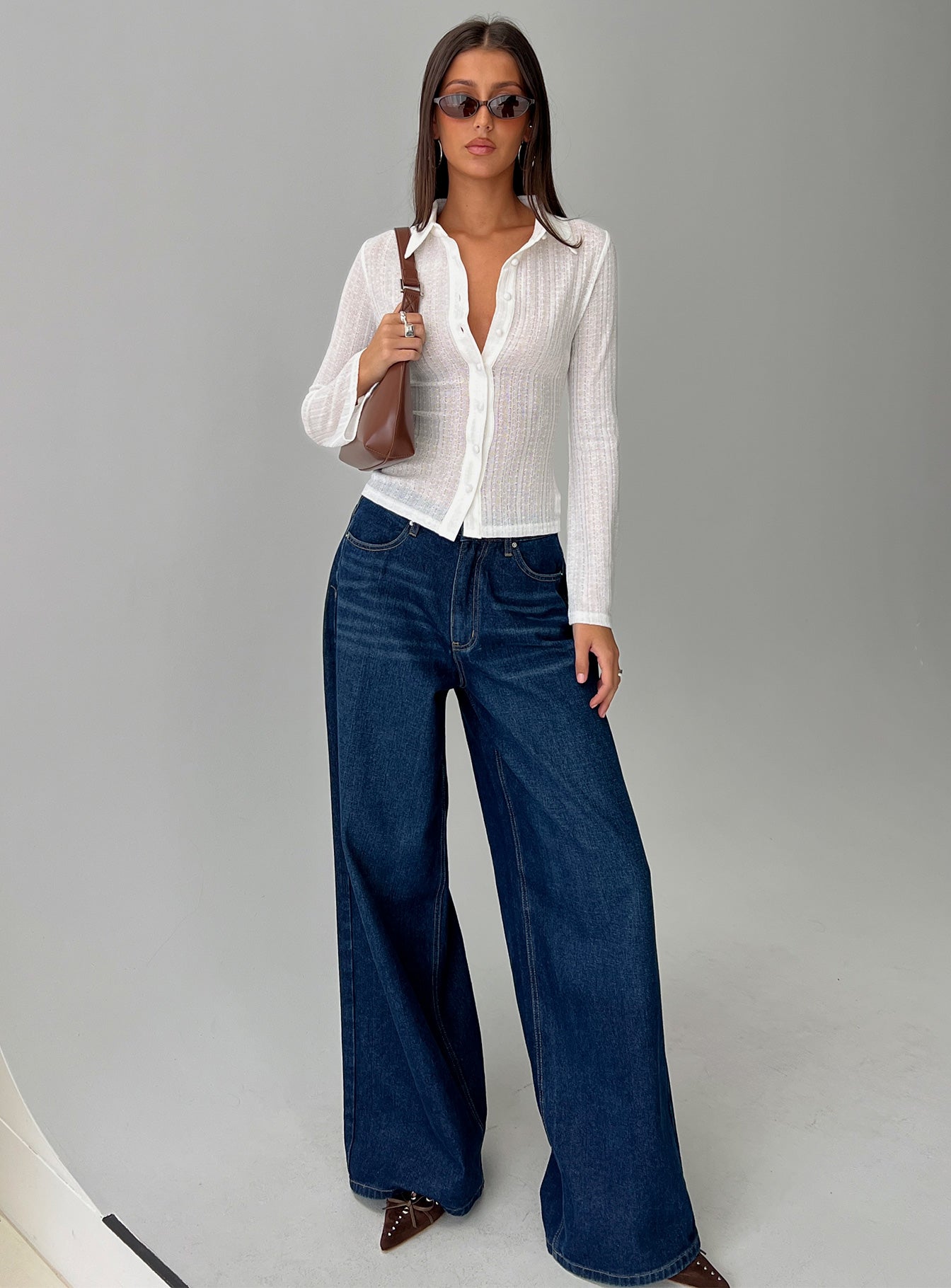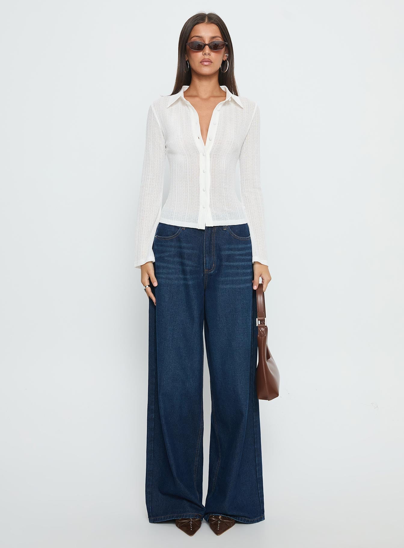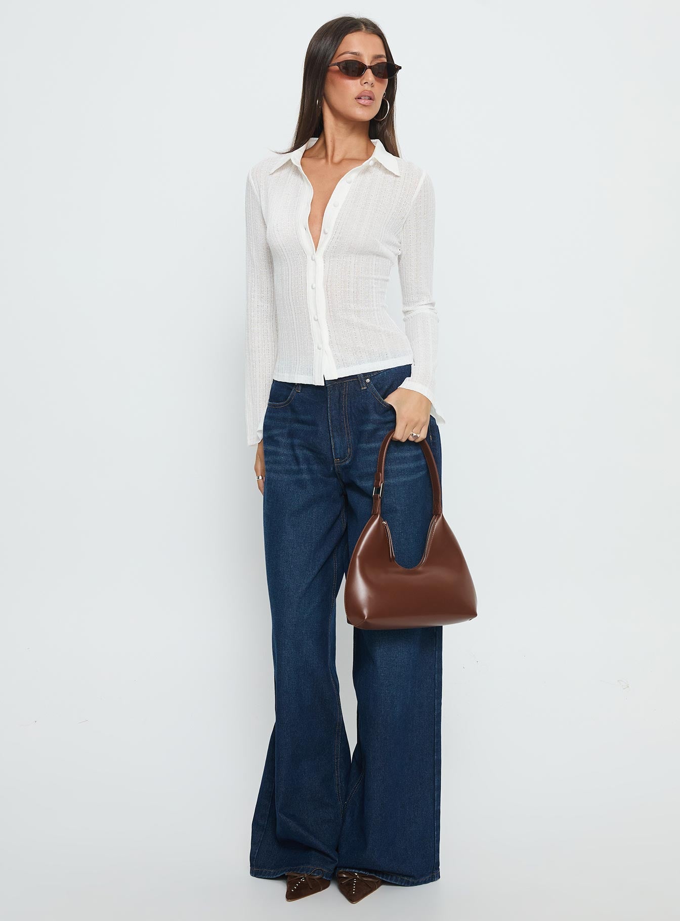- Classic collar, button closure, flared cuffs, sheer, textured fabric