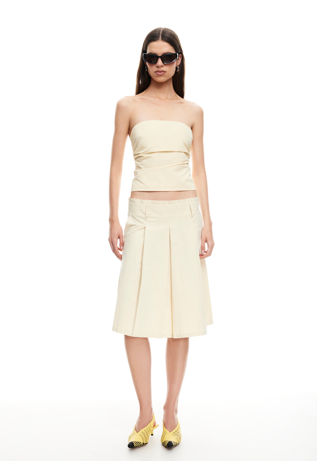 Crop top, silicon strip, folded-over pants, elasticated waistband, straight leg, mid-rise fit